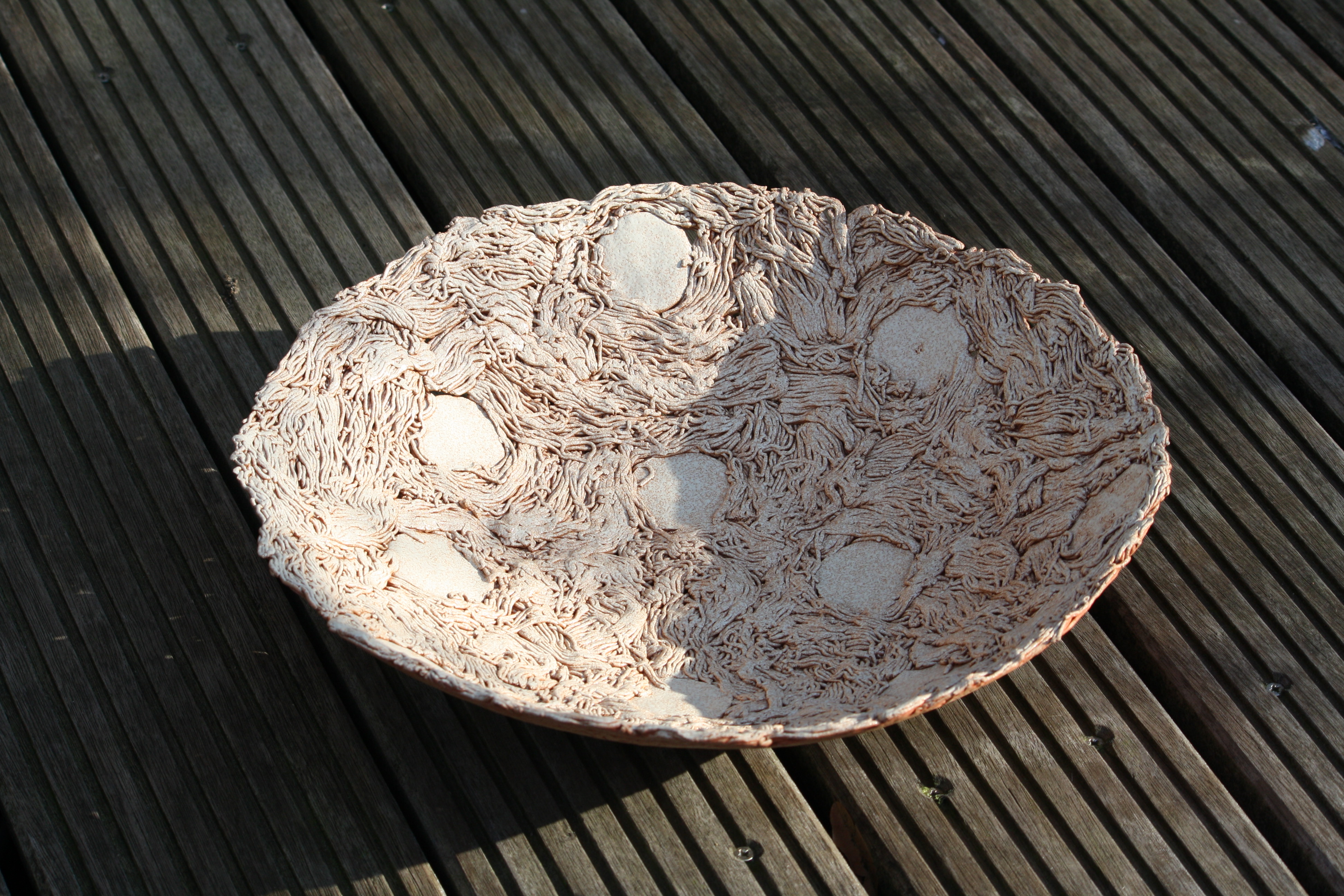 een grote kom in beige.