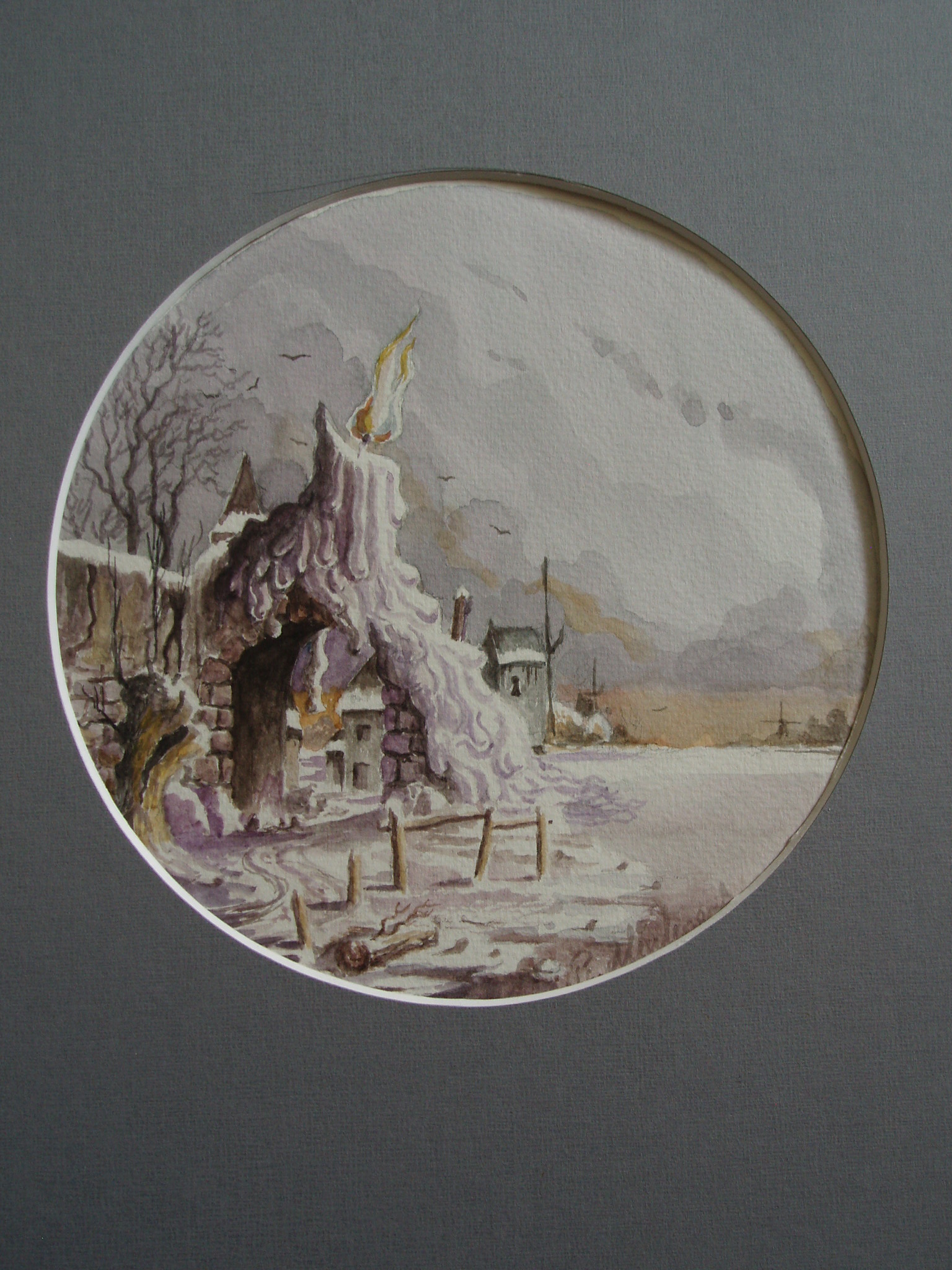 Romantiek Papier Aquarel Winterlandschap Realisme Fantasie Molen Kaars