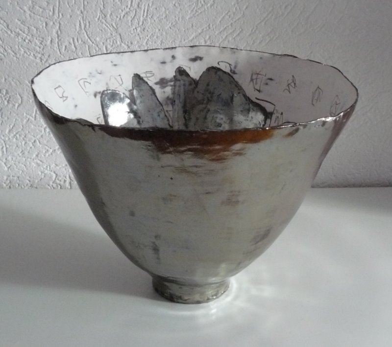 Een handgevormde schaal in de vorm van een tulp. De buitenkant is bewerkt met zilverbronzen glazuur, die terugkomt in de roosvorm aan de binnenkant. De kleiachtige bewerking aan de binnenkant is onderbroken door chineesaandoende karaktertekens.