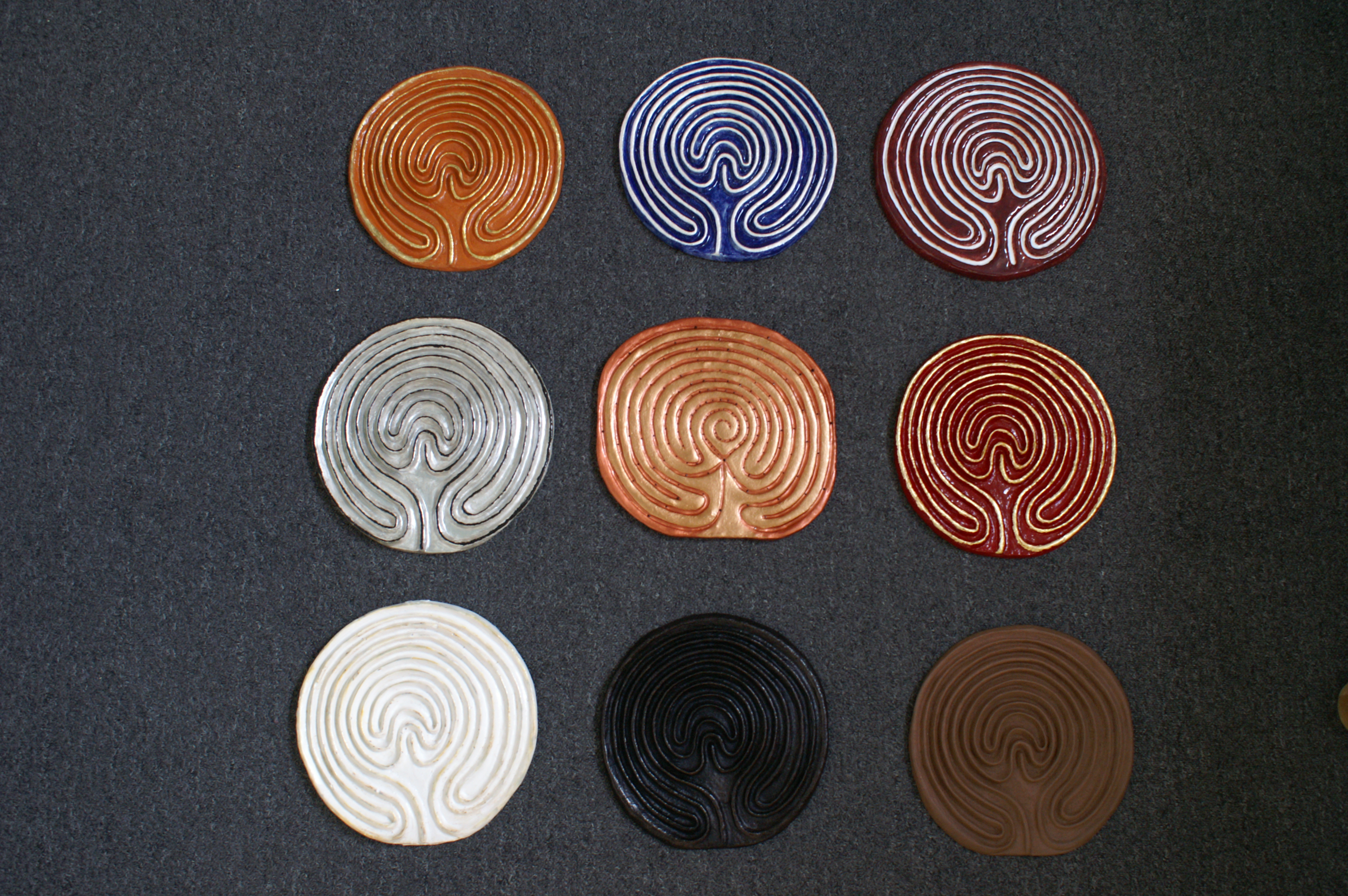 Labyrinten komen als symbool van de levensweg ovar de hele wereld voor, in het groot en in het klein, van zakformaat tot een doorsnede van tientallen meters. De weg kronkelt voor je ogen. Zou je hem met je vinger volgen, dan blijkt het een weg zonder afslagen te zijn, waarin je nooit verdwaalt. Dit zijn 9 keramische labyrinten, ieder met een eigen afwerking: glazuur, acryl, bladgoud, was. Prijzen afhankelijk van de afwerking