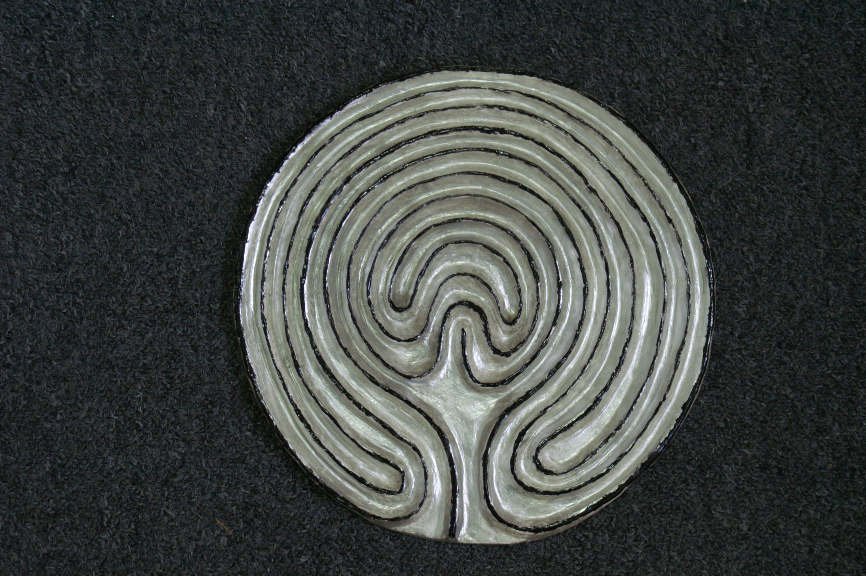 Labyrinten komen als symbool van de levensweg over de hele wereld voor, in het groot en in het klein, van zakformaat tot een doorsnede van tientallen meters, waar je doorheen kunt lopen. Dit is een labyrint gemaakt van klei en beschilderd met acrylverf. Sommige mensen zien er een boom in, of de structuur van hersenen. Als je ernaar kijkt, duizelt het pad van dit labyrint voor je ogen. Wanneer je hem met je vinger zou volgen, dan blijkt het een enkele weh te zijn zonder afslagen. Je kunt er niet in verdwalen.