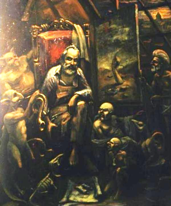 'Deze hardwerkende kunstenaar heeft een hele eigen specifieke timing en creatief proces.Elk nieuw werk is een vervolg op het vorige. Uit zijn eigen creatieve brein ontstaan complexe composities in olieverf.Zijn aparte stijl en techniek zijn uniek.'