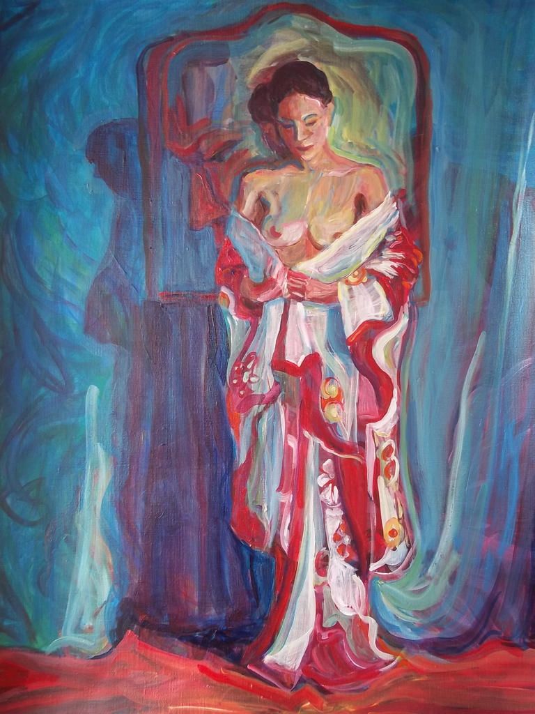 een vrouw van italiaanse/japanse herkomst dragt een kimono in een Breitnerachtig scene.