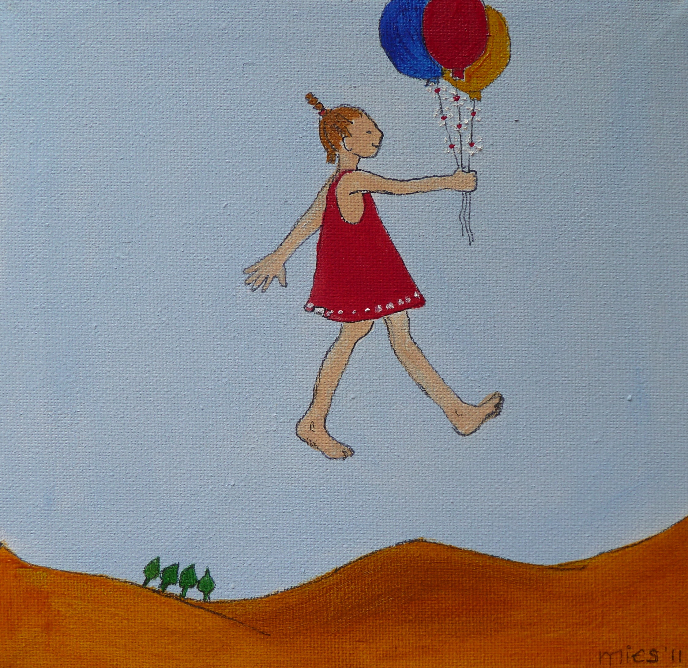 Een meisje met 3 ballonnen in de lucht in een geabstraheerd landschap