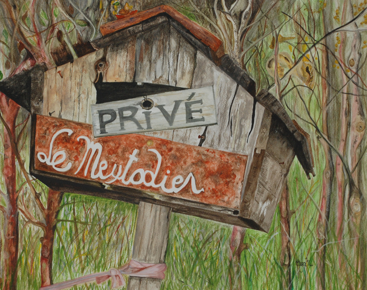 Hand made postbox guards the entry to ruined farm buildings . The heights above Mareuil, SW France.