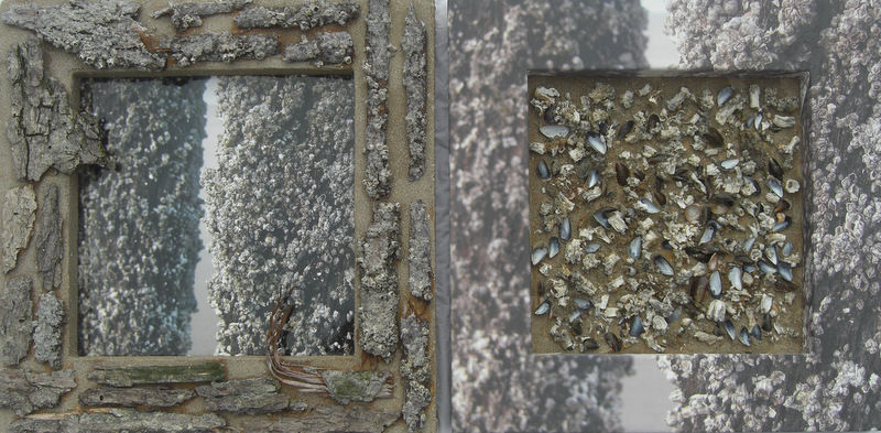 Abstracte composities van schelpen, zand, en stof. Abstracte composities van het Zeeuwse Land. Abstracte Schilderijen.