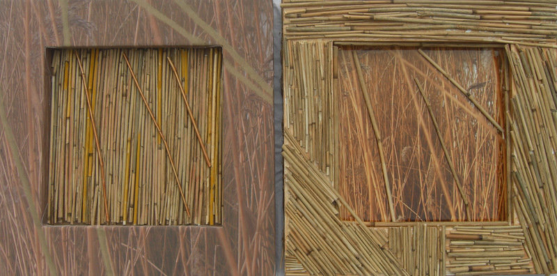 kunstwerk met verschillende materialen: foto, foto op behangpapier, riet