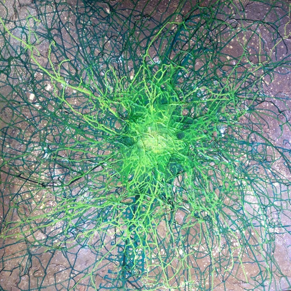 Een borduurwerk van ondere is warrig en door elkaar maar van bovenaf is het vaak prachtig, zo kan ons leven ook gezien worden en begrijpen wij vaak niet hoe ons warrige leven in elkaar zit of hoe de wereld in elkaar steekt. Acrylverf op een linnendoek dat gespannen is over een sterk houten frame