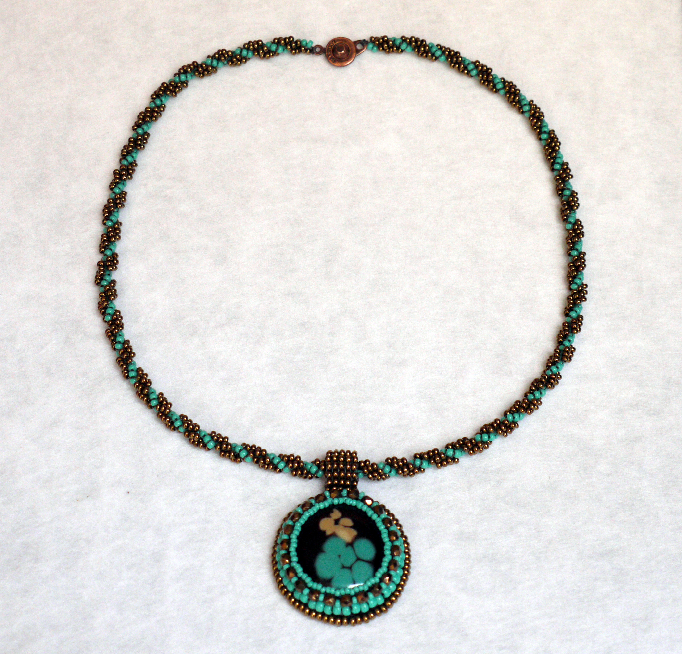 Hanger met zelfgemaakte glascabochon, omringd met turquoise en koperkleurige rocailles en Tsjechische glasfacetten. Lengte ketting is 40cm.