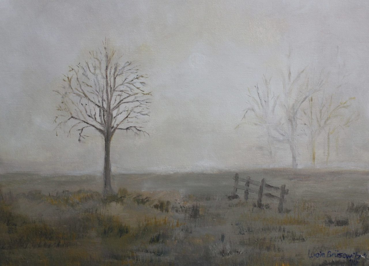 Een landschap in de mist met in de verte nog enigszins zichtbaar een aantal bomen. Je voelt de stilte.