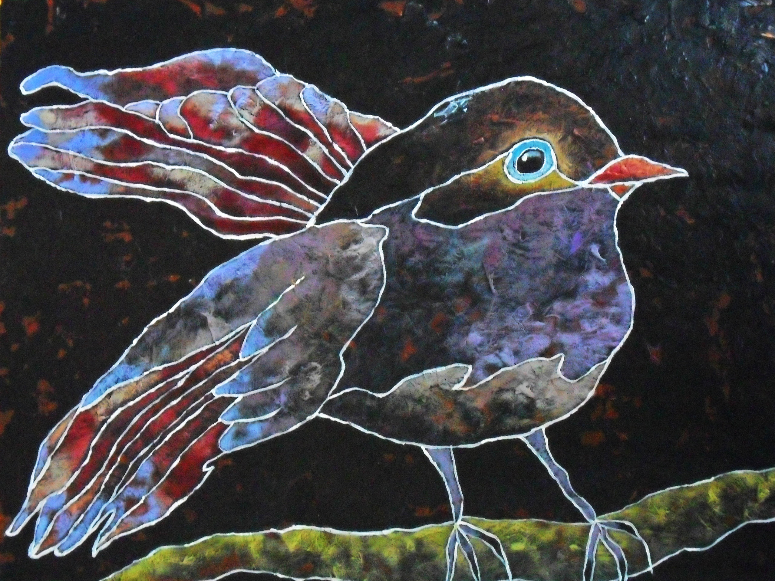 Heel veel werk gehad aan de ondergrond, een ruwe imperfecte ondergrond. Daarop heel voorzichtig een verstilde afbeelding van een vogel. Zo mooi mogelijk en ingetogen kleuren