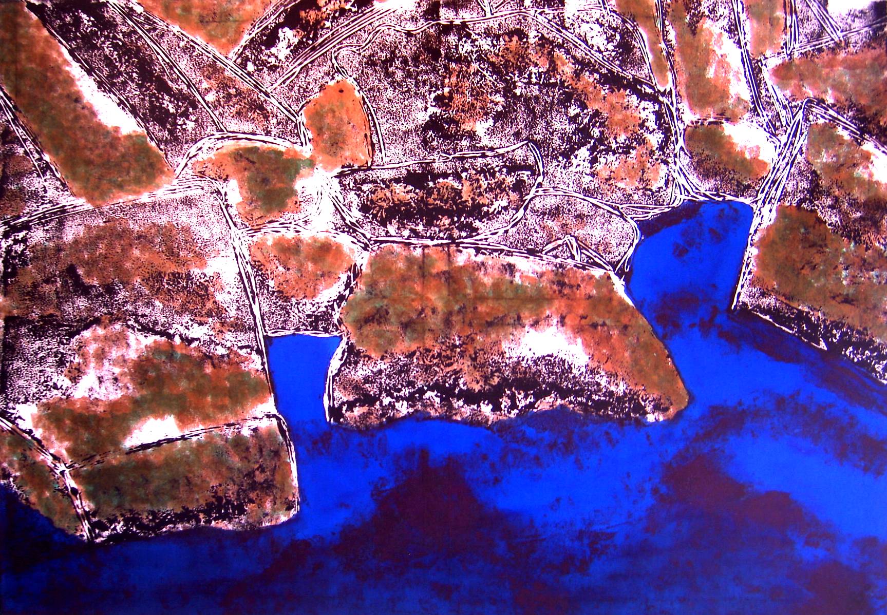 Break through is een monotype van een geabstraheerde dijk van basaltblokken met water. Later heb ik met blauwe ecoline de zee gesymboliseerd en met groene en bruine ecoline de mosaanslag op de basaltblokken.