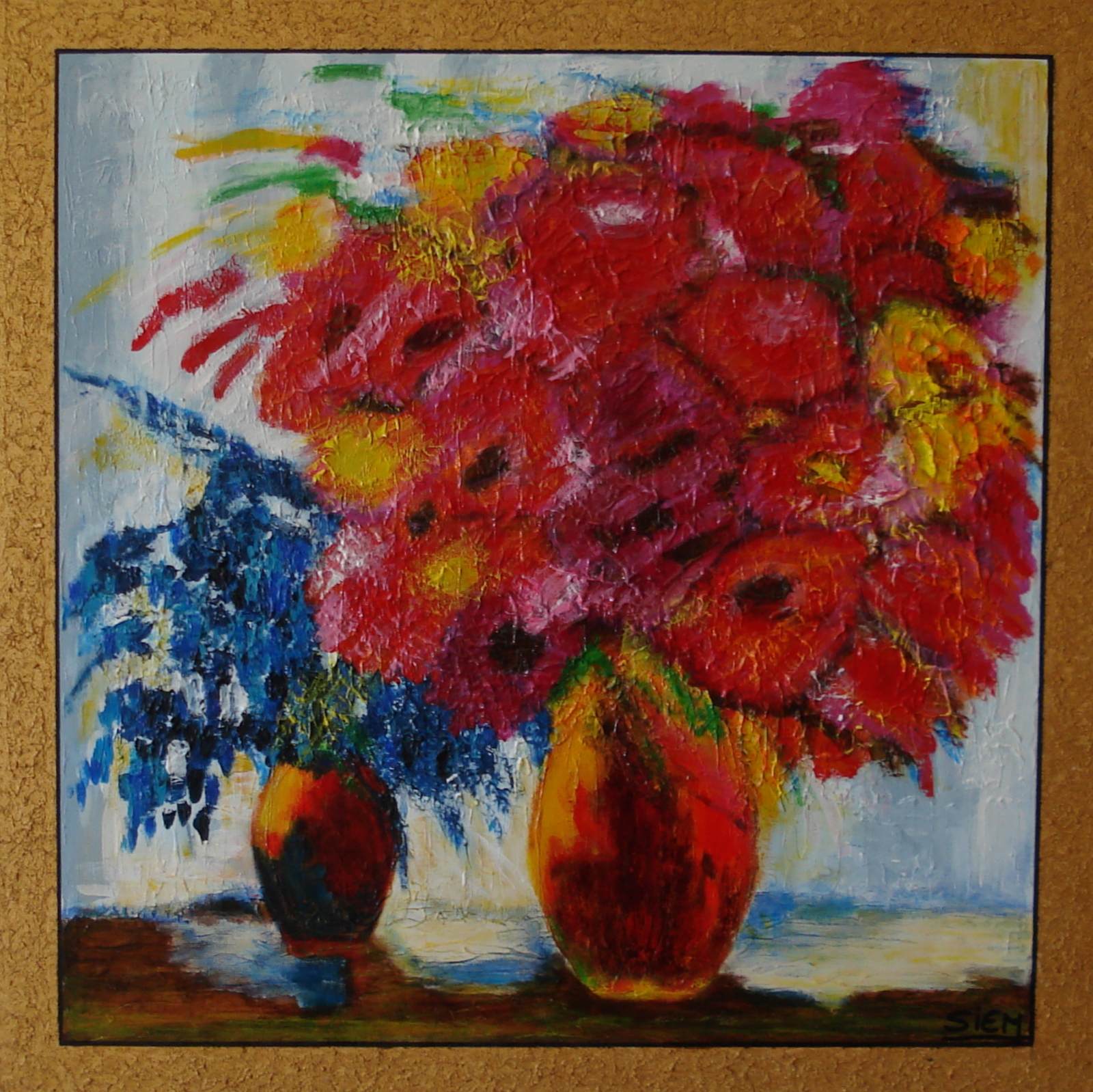 Stilleven bloemen, met goudkleurig geschilderde passe-partout op witte achtergrond, met 3D goudkleurige baklijst (hier niet getoond)