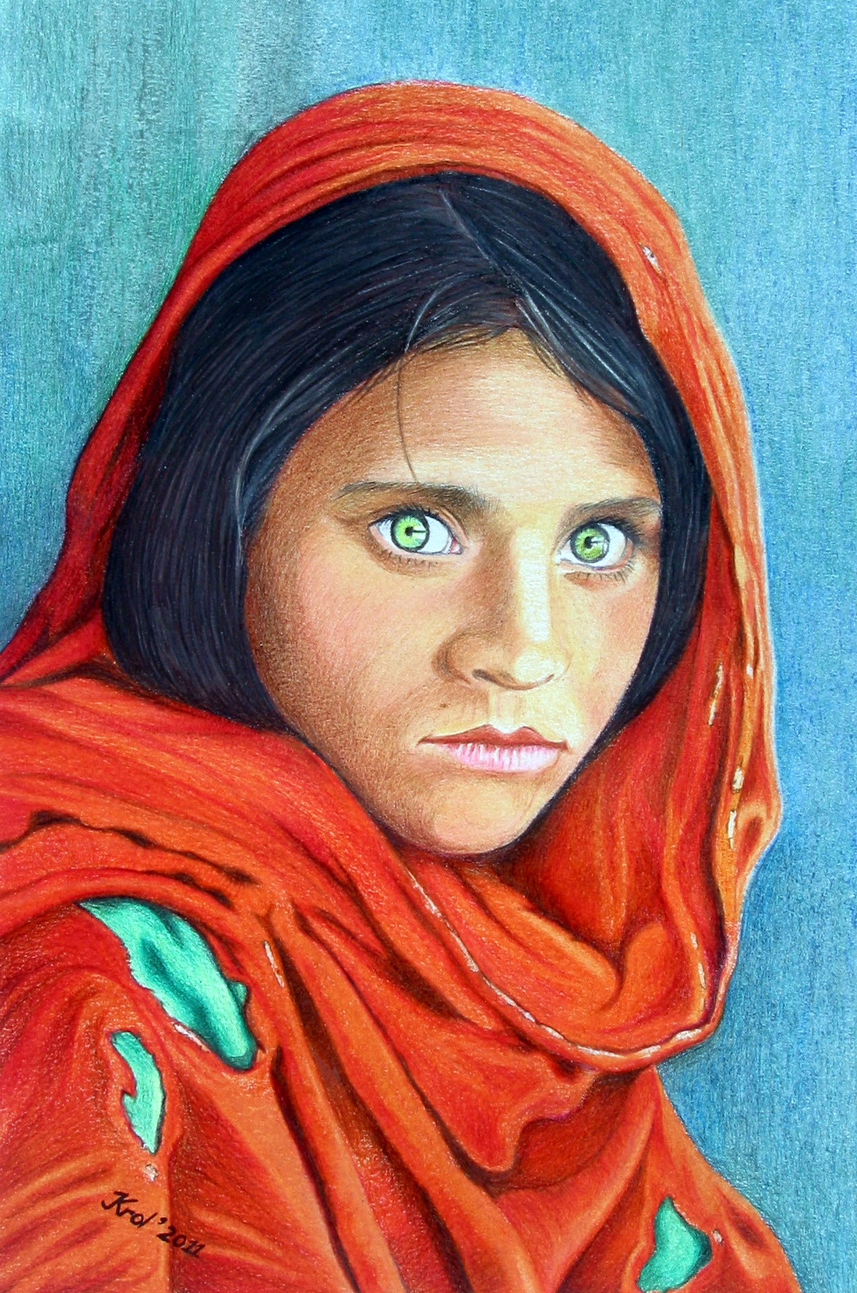 Het meisje met de beroemde groene ogen, naar de beroemde foto van Steve McCurry die in 1985 de cover van de het blad The National Geographic sierde.