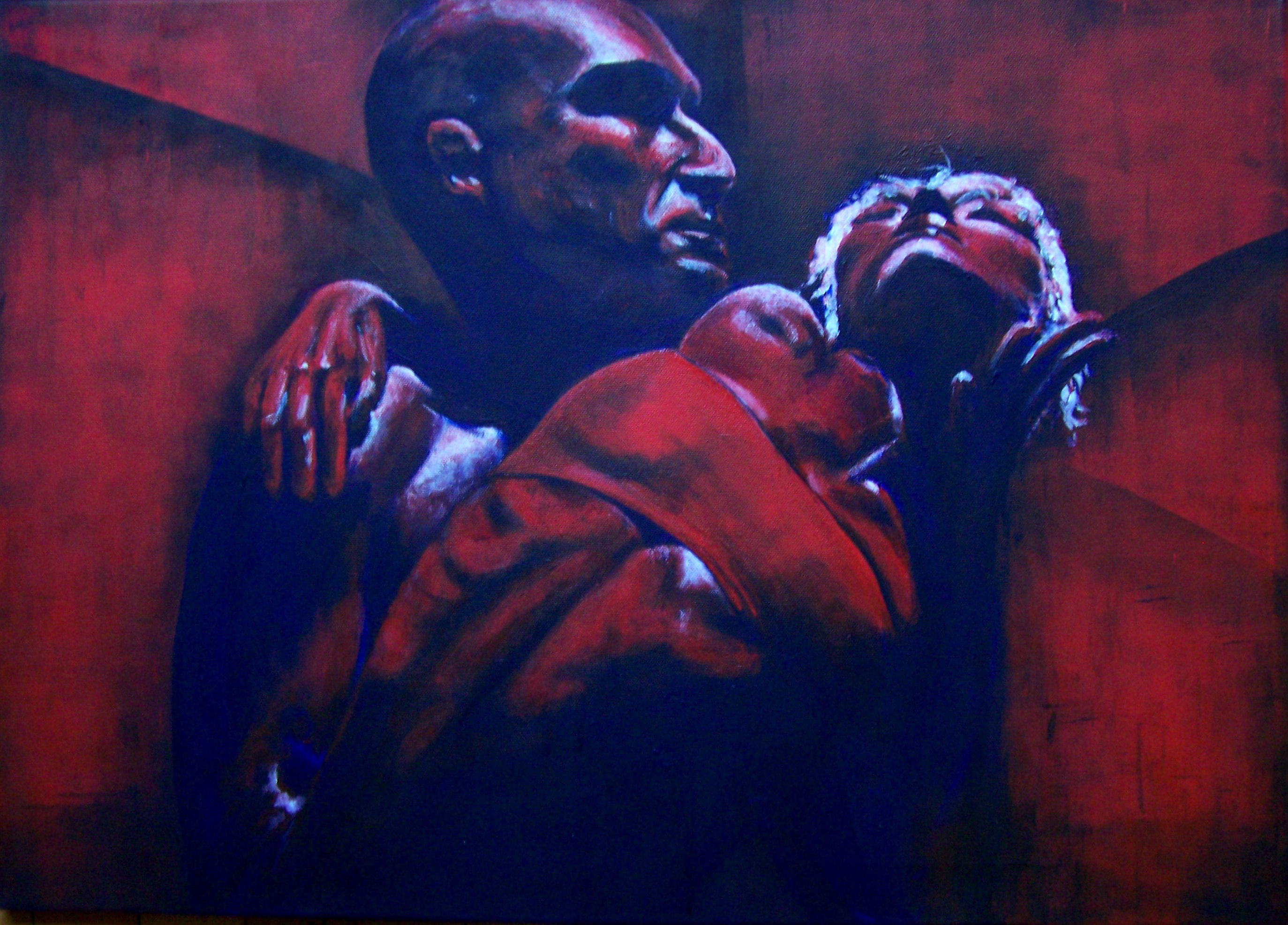 Realistisch expressief portret van een dansen paar. Geschilderd in 3 kleuren: Rood, blauw en wit.
