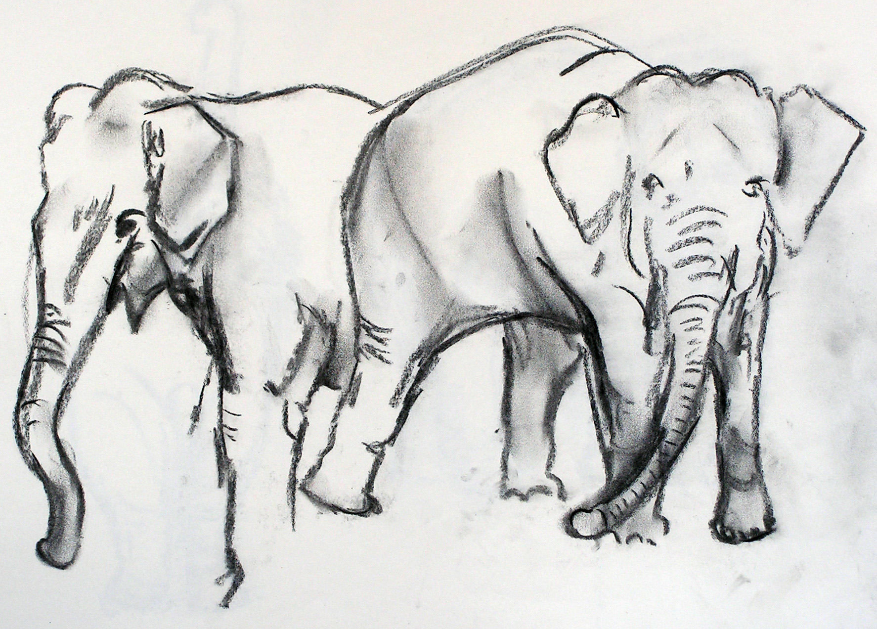 Twee Schets Dier Realistisch Two Passepartout Houtskool Charcoal Olifanten Animal Mat Dierentuin Artis Zoo Elephants Realistic Sketching Cremekleurig Creamcoloured