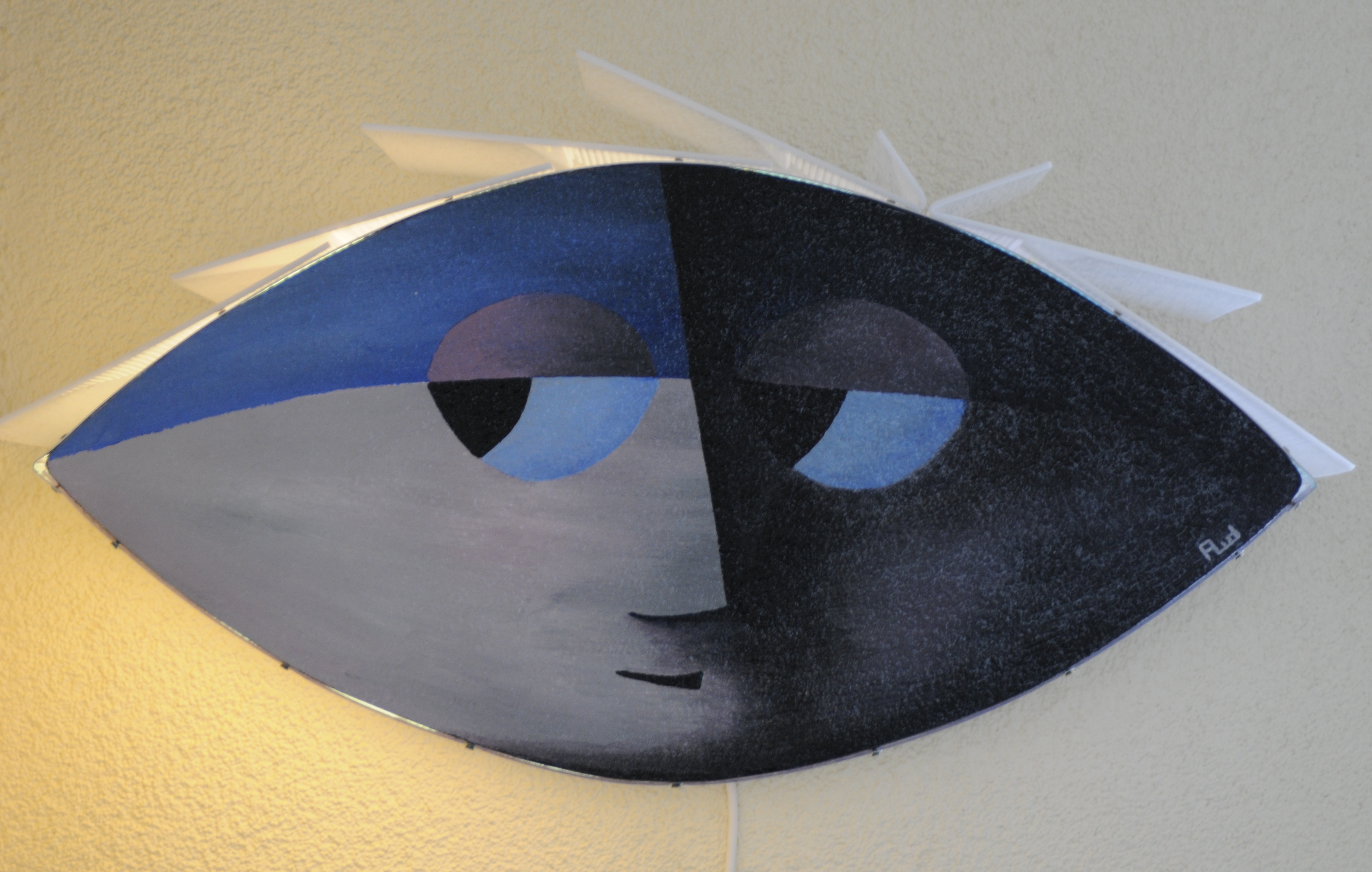 "What Ever" Unieke lamp met eigen beschildering in acrylverf gemaakt van hout, aluminium gaatjes plaat, kunststof, verf Wit licht ( spaarlamp ) aan de linkerkant en verlopende kleur LED lamp aan de rechterkant.