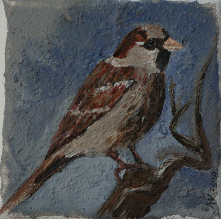 Natuur Mus Sparrow Vogel Grijs Bruin Wad Strand Terras Eiland Terschelling Mixed-media Gemengde Techniek Acryl Kunst