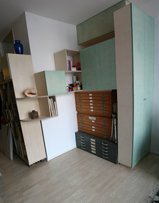 kast in een smalle kamer die het bestaande meubilair in de kamer verbind en integreert. Werkkamer.
