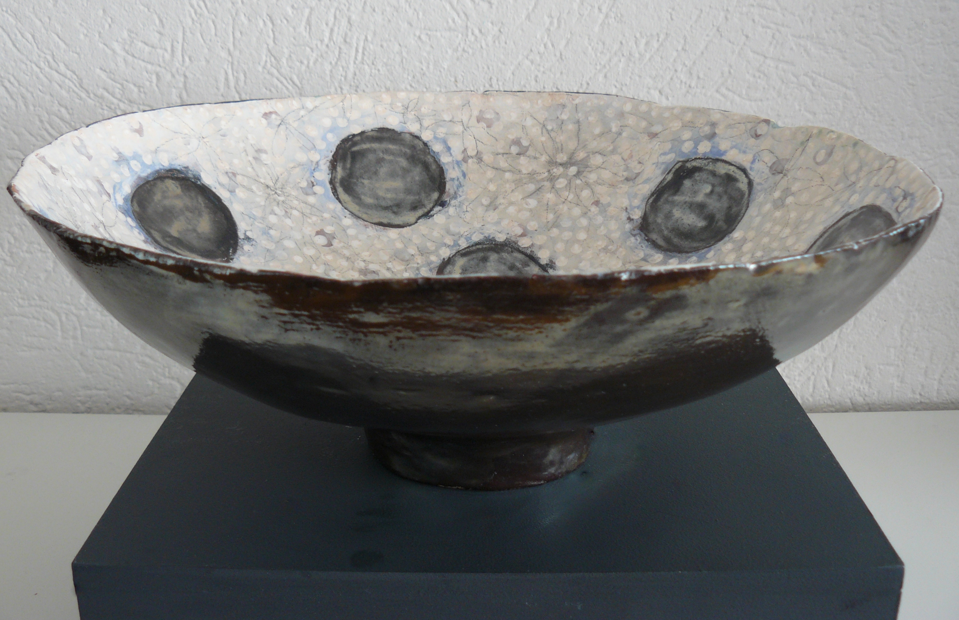 Een handgevormde schaal met een diameter van 37 cm. De schaal is afgewerkt met oxides, engobes en zilverbrons glazuur, in verschillende lagen aangebracht.