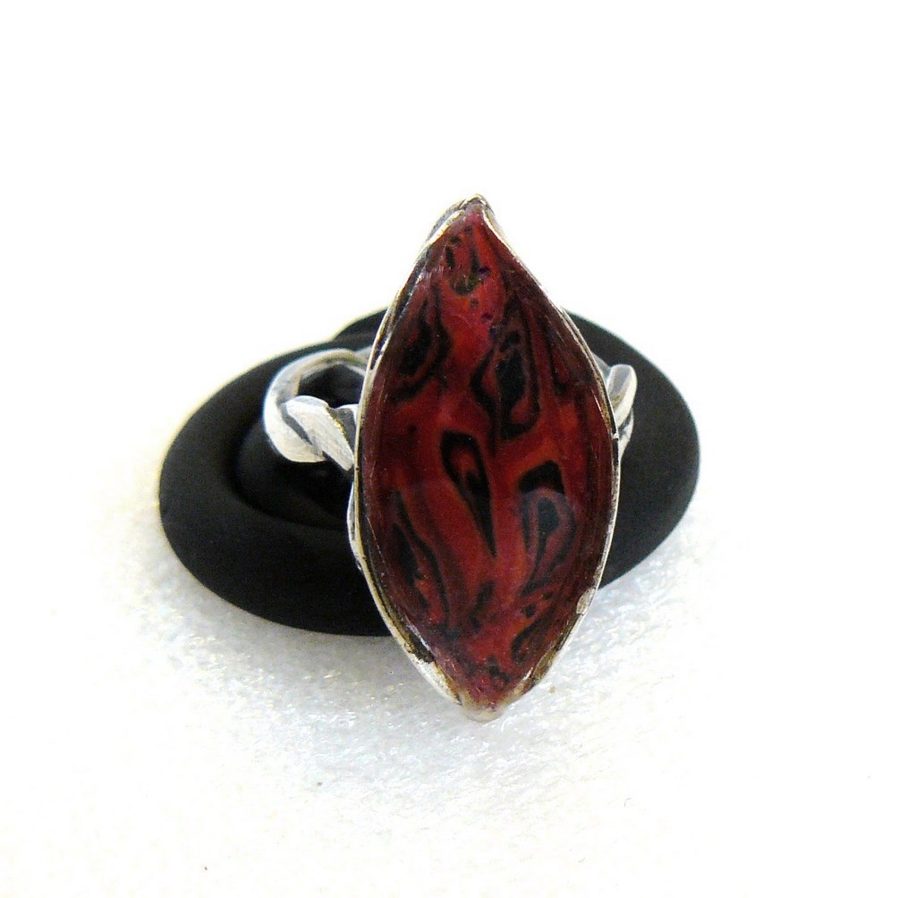 Ring 999 zilver met Mokume Gane inleg van polymeerklei en afgewerkt met UV hars. Ringmaat 18,5 mm.