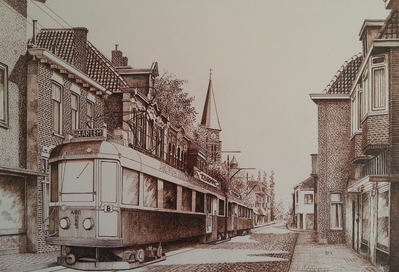 De bekende Blauwe tram passeert hier de Hoofdstraat in Sassenheim. Deze tram verdween in de zestiger jaren uit het straatsbeeld.