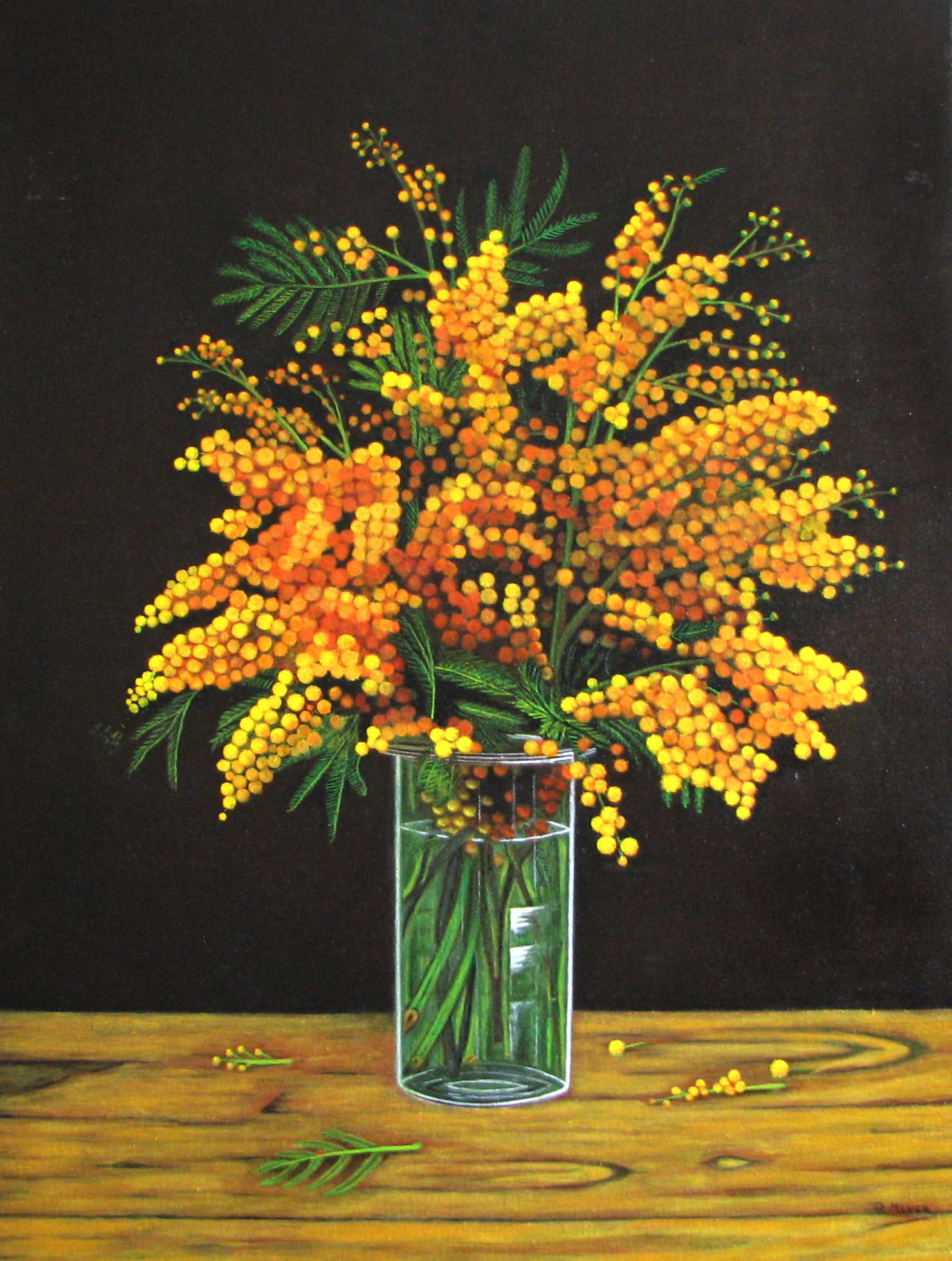 Mimosa boeket in een glazen vaas tegen een donkere achtergrond
