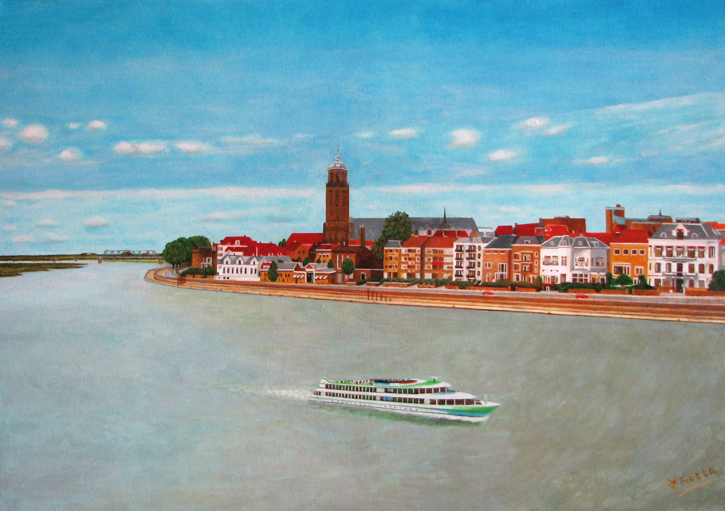 Landschap schilderij van een stukje IJssel bij Deventer met stadsgezicht.