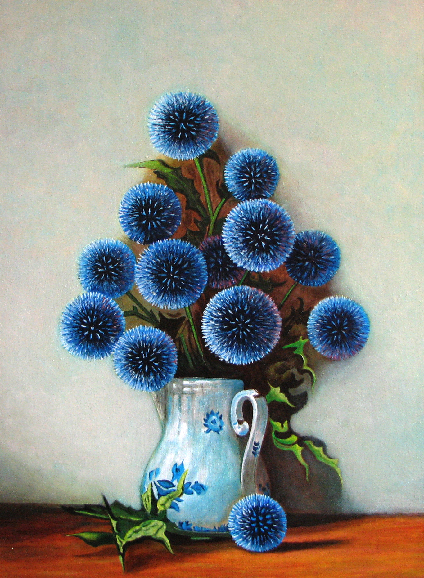 Bloemstuk met distels. Schilderij is voorzien van een geschilderde rand.