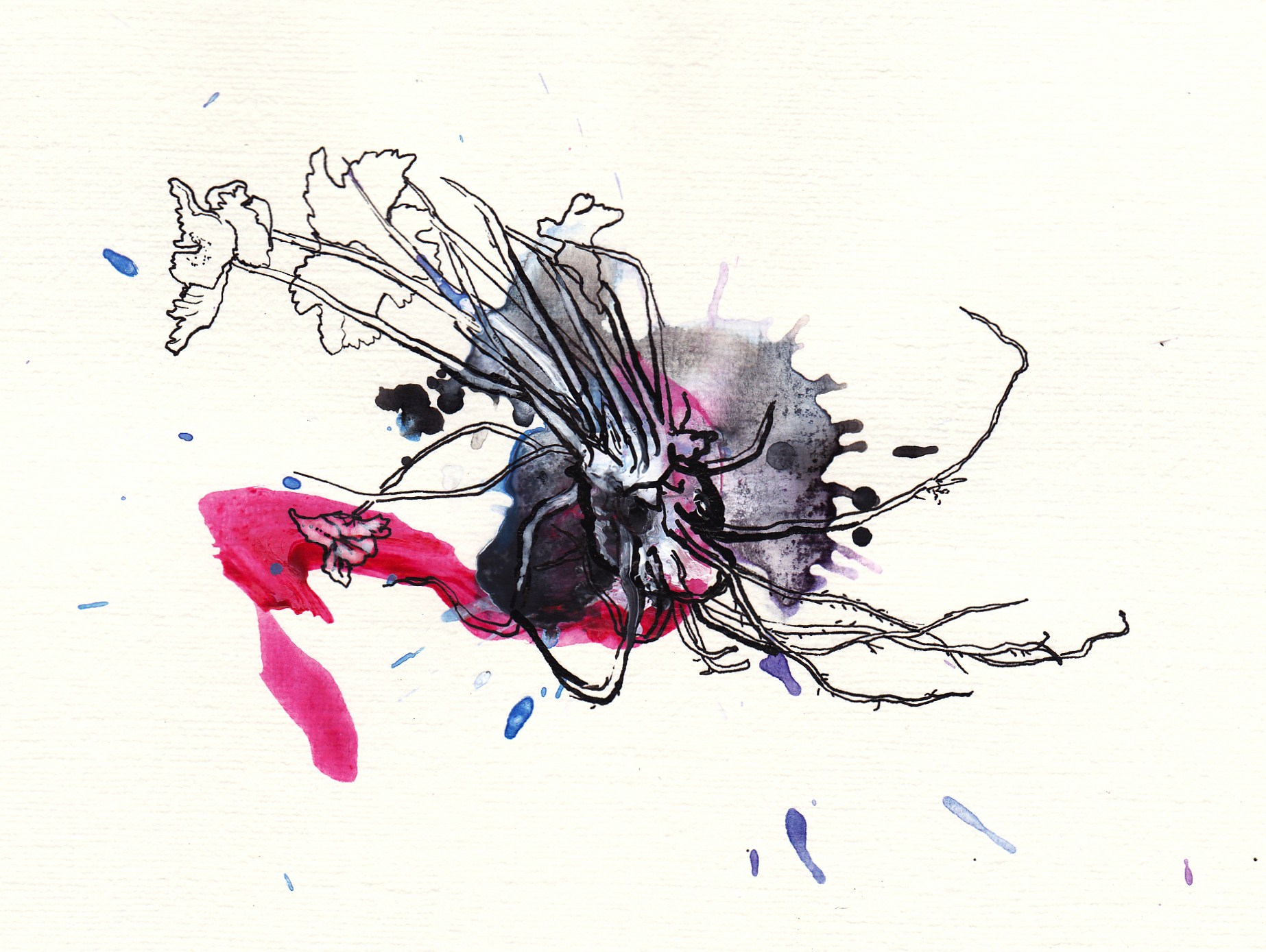 Acrylverf en O.I.-inkt op papier Incl. passepartout met aliumium-kleur-lijst