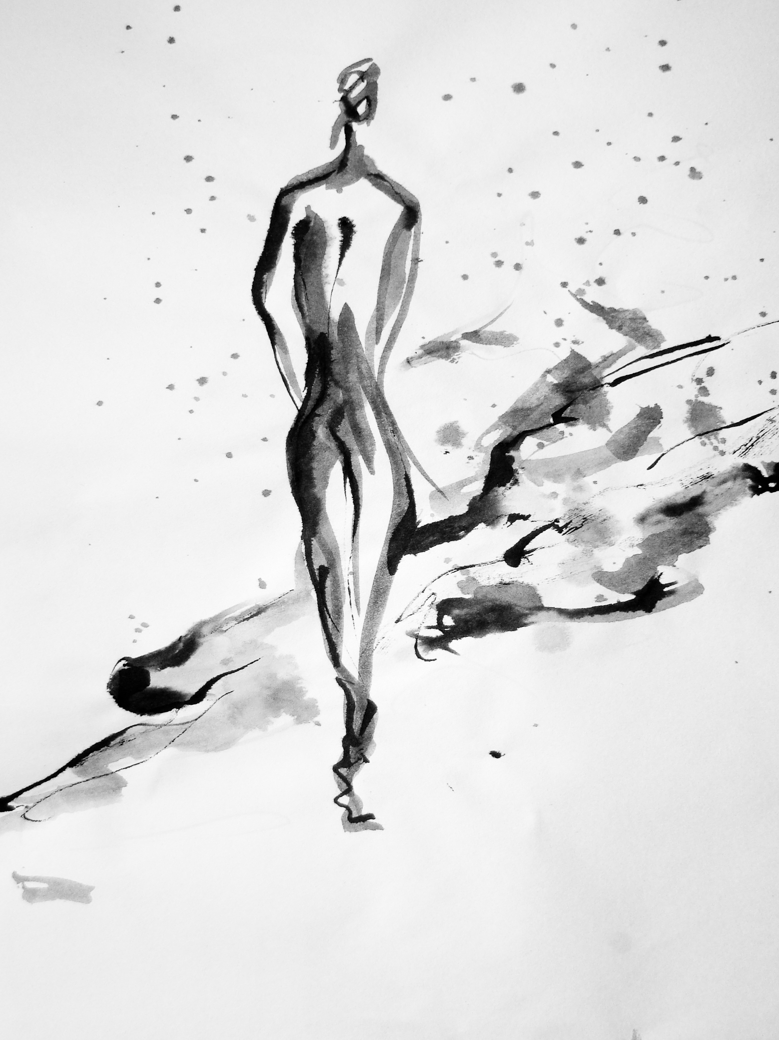 Inkt Rietpen Penseel Abstraherend Vrouw Strand Schaduwen Tekening Zwart-wit