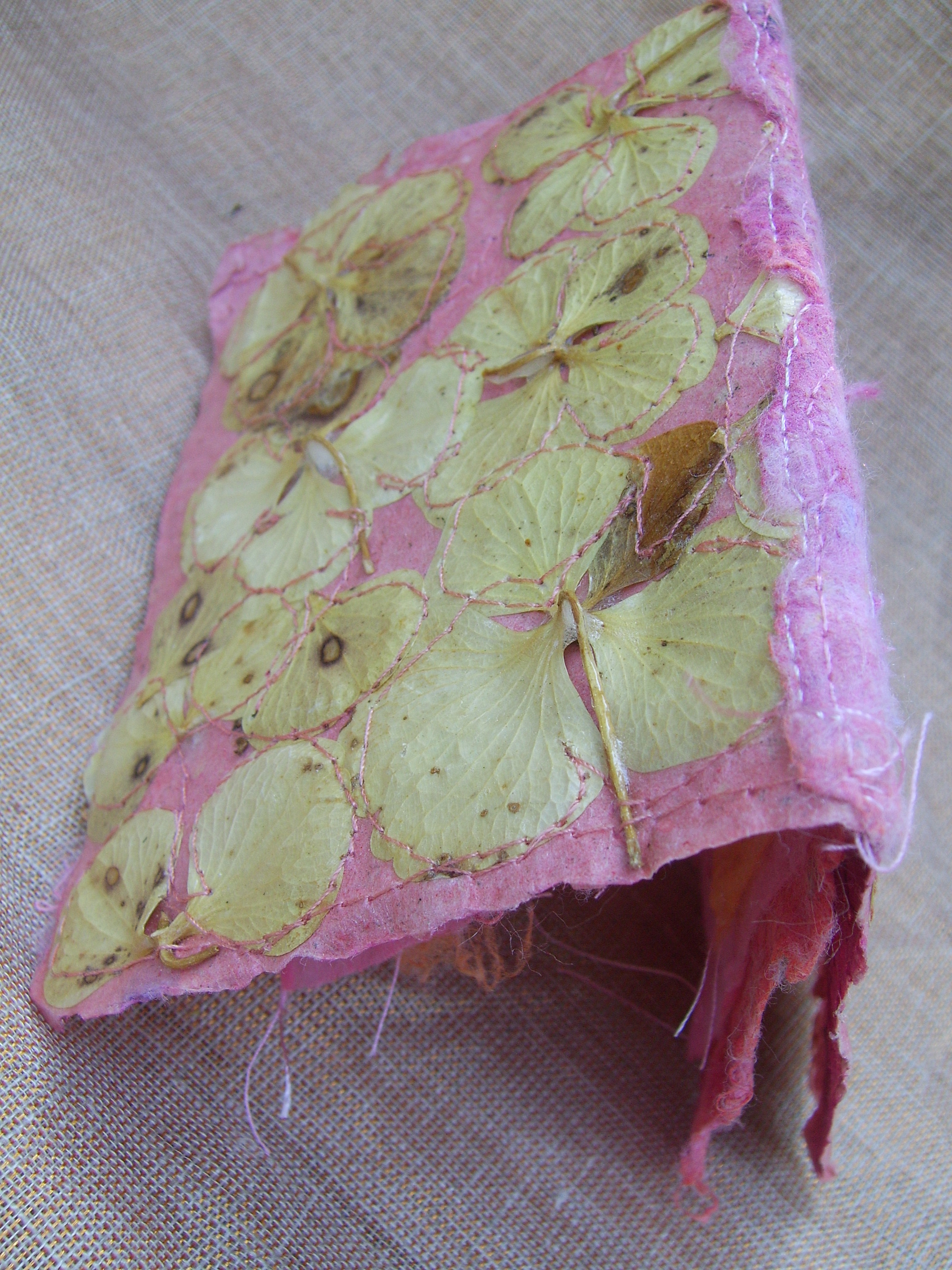 natuurboekje van papier en plantenmateriaal; papier gecombineerd met primula, bladeren, draden, stikwerk, schilderwerk