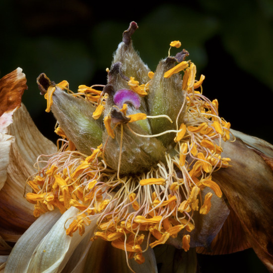 Close-up van het hart van een pioen-roos in verval
