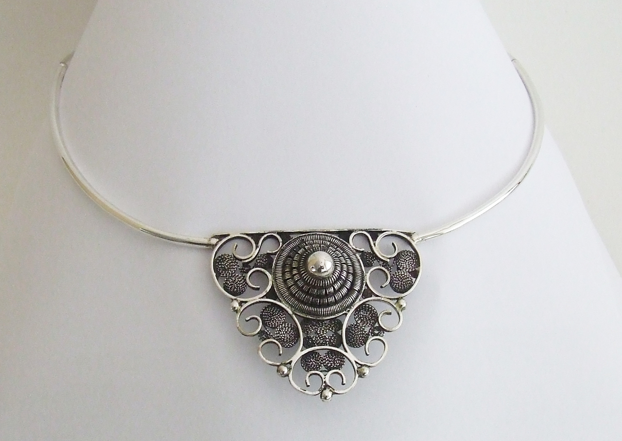 De antieke halve gesp is opgenomen in een zilveren buis, met twee scharnierpunten op de schouders, zodat het sieraad soepel om de hals valt. Het geheel is hoogglans gepolijst. (ontwerpopdracht S1167)