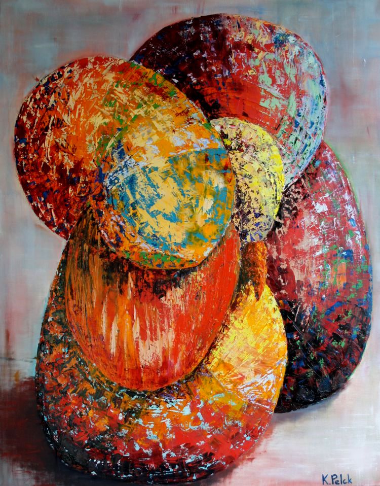 Karen Pelckmans schildert vanuit kleuren en raakt geinspireerd door visuele indrukken uit de directe omgeving. Soms hanteert ze daarbij foto's die ze eerst maakt van de voorstelling om een basis te hebben. Die basis werkt ze dan in een aantal stappen verder uit.