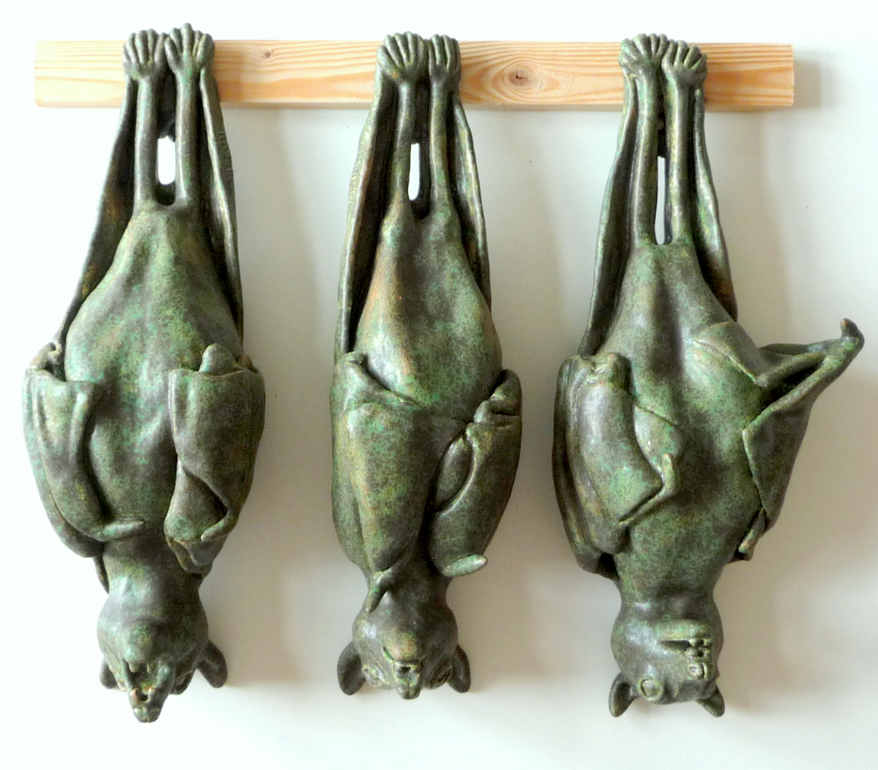 set van 3 vleermuizen, hangend, handgevormd van klei, geglazuurd, bruin/groen/geel gemeleerd. afmeting: 3 losse vleermuizen van 29x10x8 cm per beeld