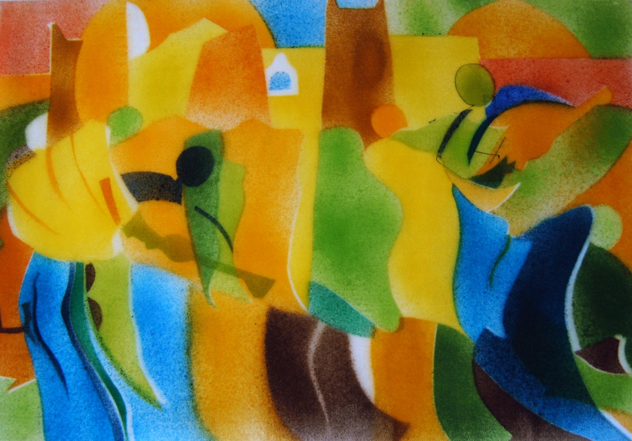Figuren Geel/blauw Zijdeschildering