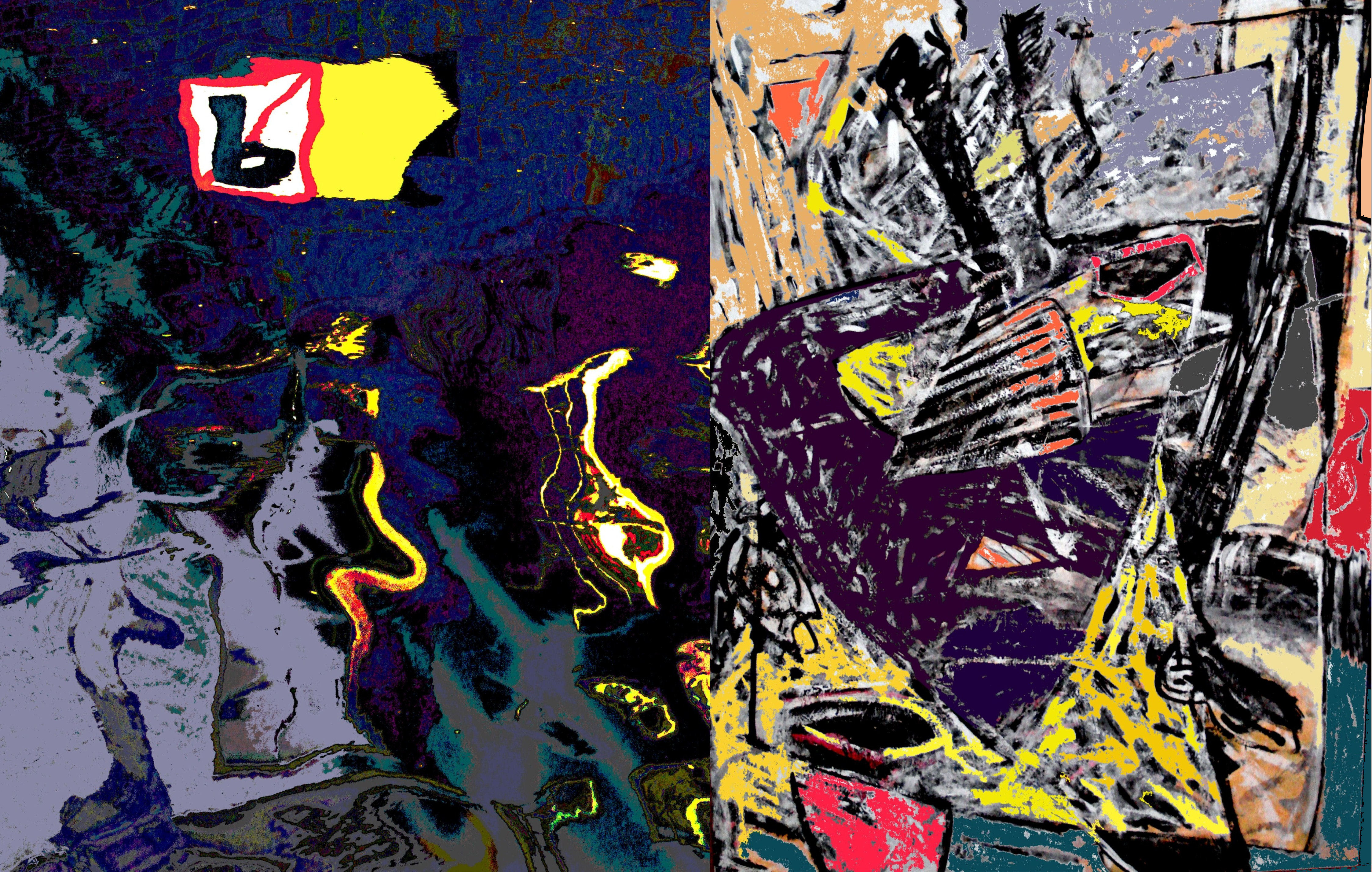 Digitaal bewerkte collage van gefotografeerde en geschilderde beelden uit Amsterdam. Gedrukt op 310 grs. Hahnemühle Fine Art papier.