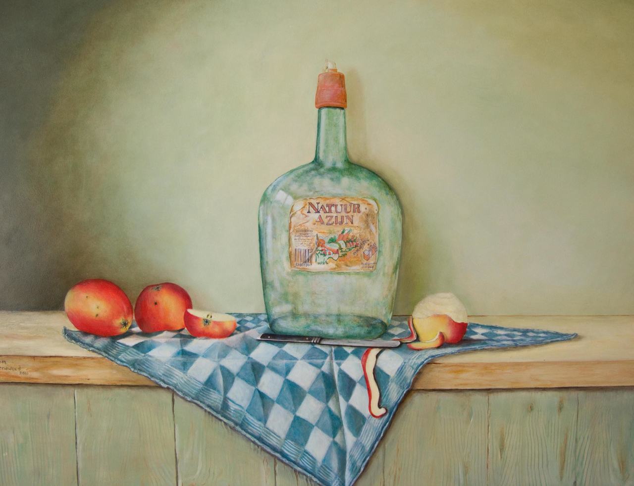 Een zeer oude azijnfles, een theedoek wat appels en een mes. Olieverf op paneel , met lijst.