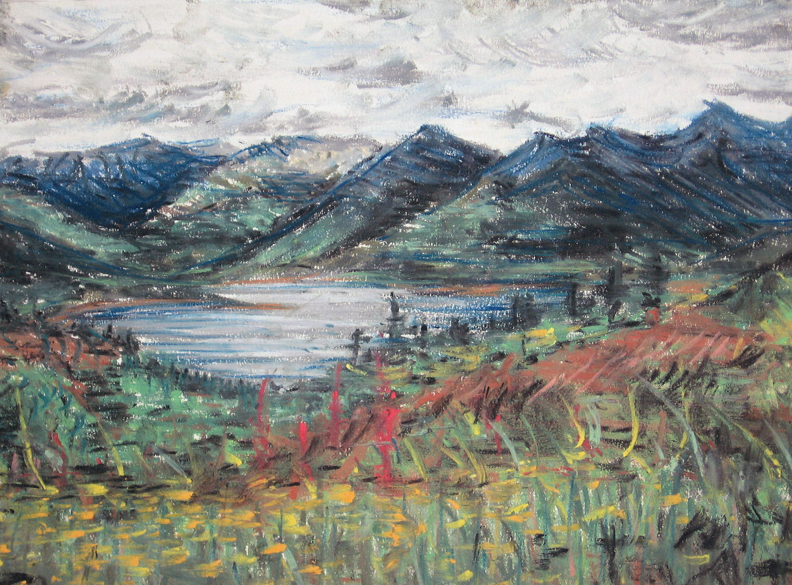 Snelle schets, impressie, ter voorbereiding voor een aquarel. Pastelkrijt op papier.