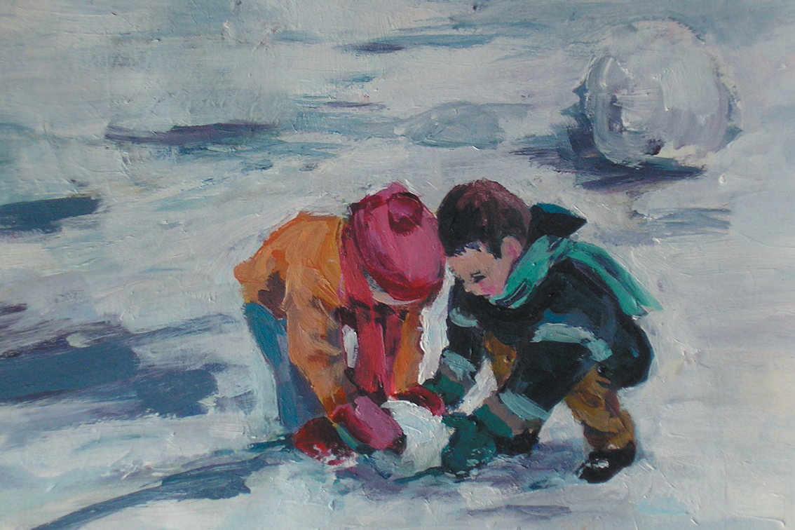 Acryl Sneeuw Samen Koud Winter Spelen Kinderen Illustratie Vrienden Sneeuwpop