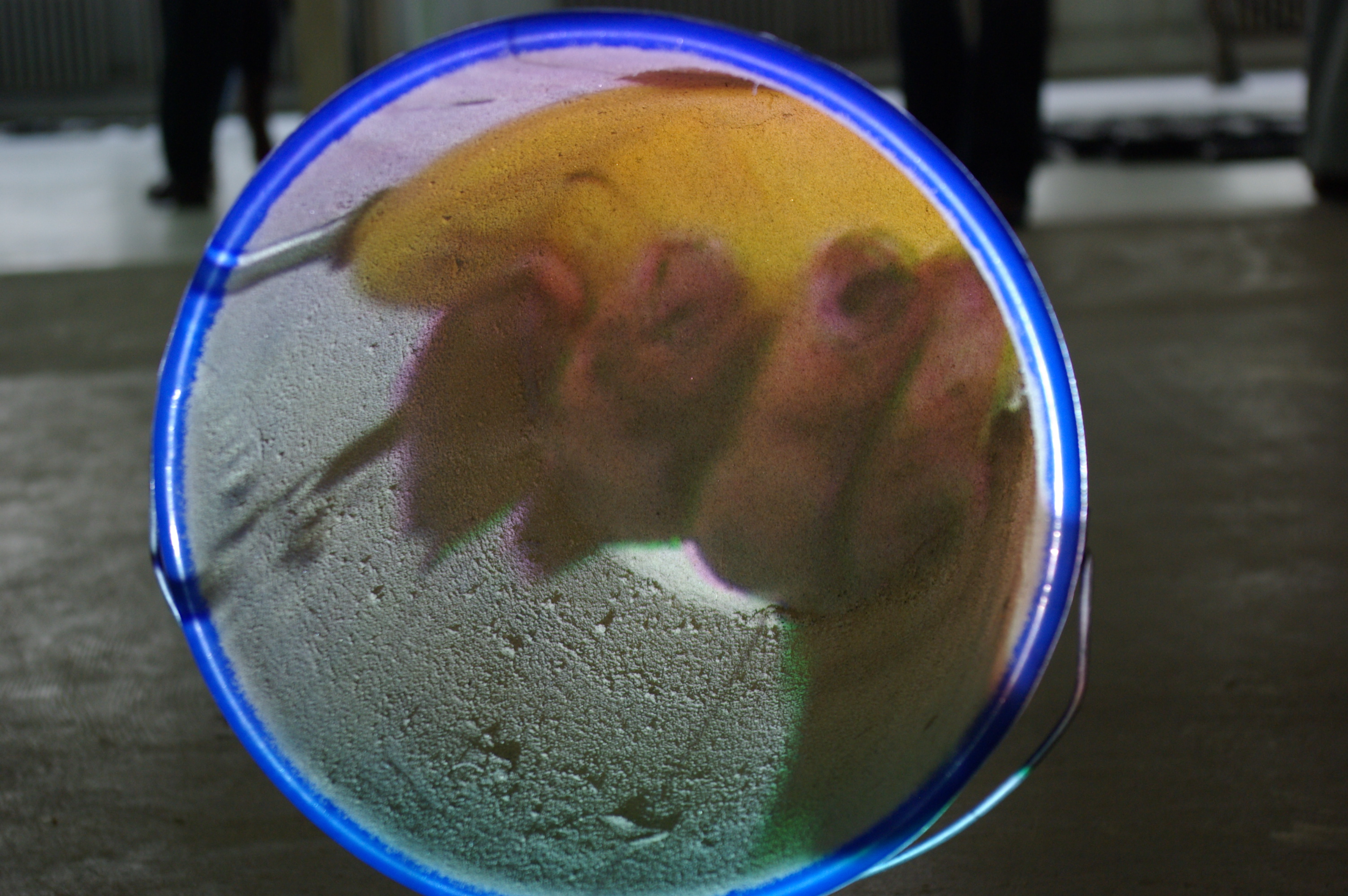 Videoprojectie in emmer met zand. Wassende handen.