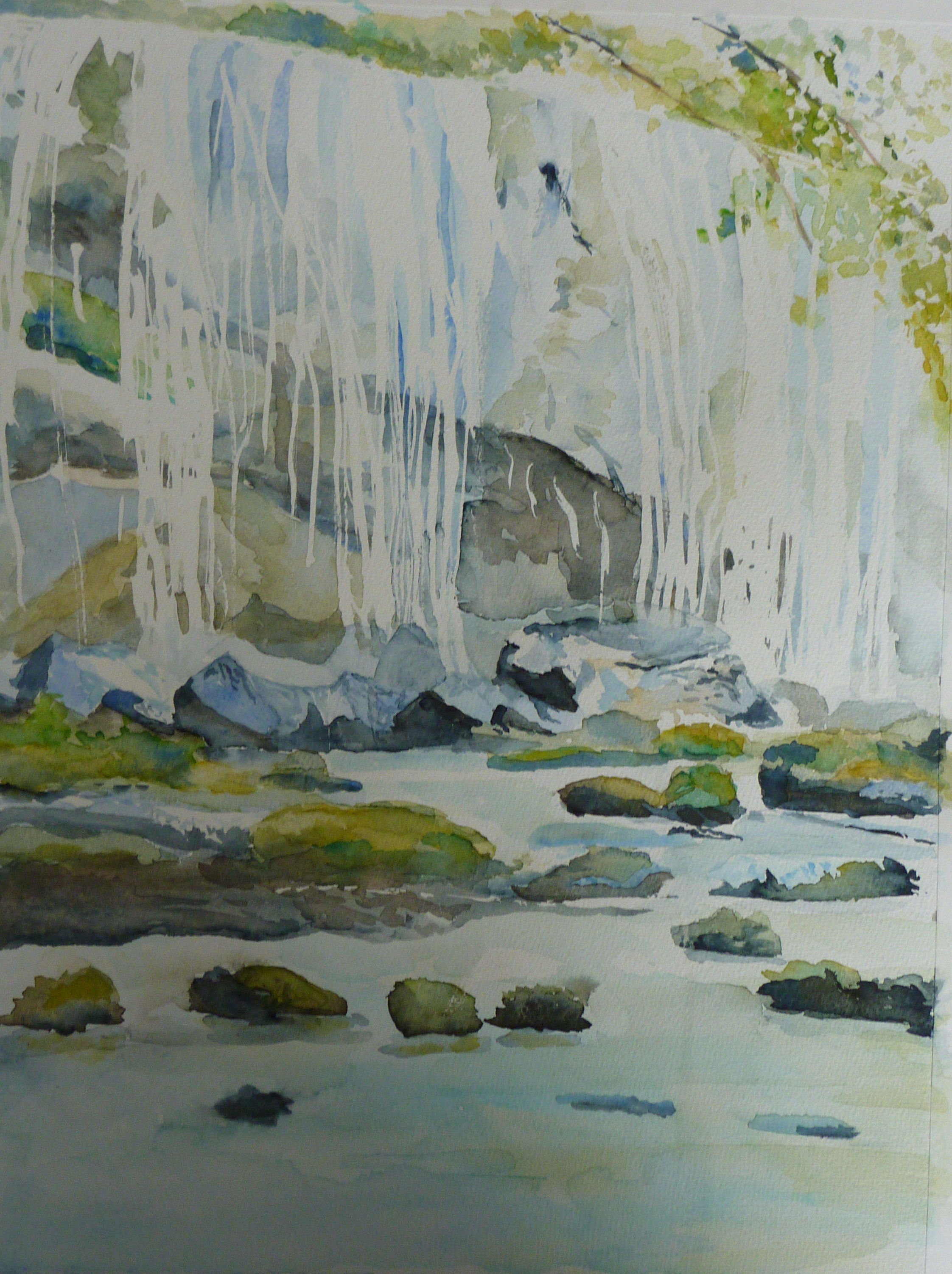 Een woeste waterval levert een idyllisch plaatje op. Aquarel is een geweldige techniek om niet te precies te werken. Voor deze aquarel heb ik ook speciaal 'extra vloeiend' papier gebruikt, waardoor het water nog meer zijn eigen weg gaat.