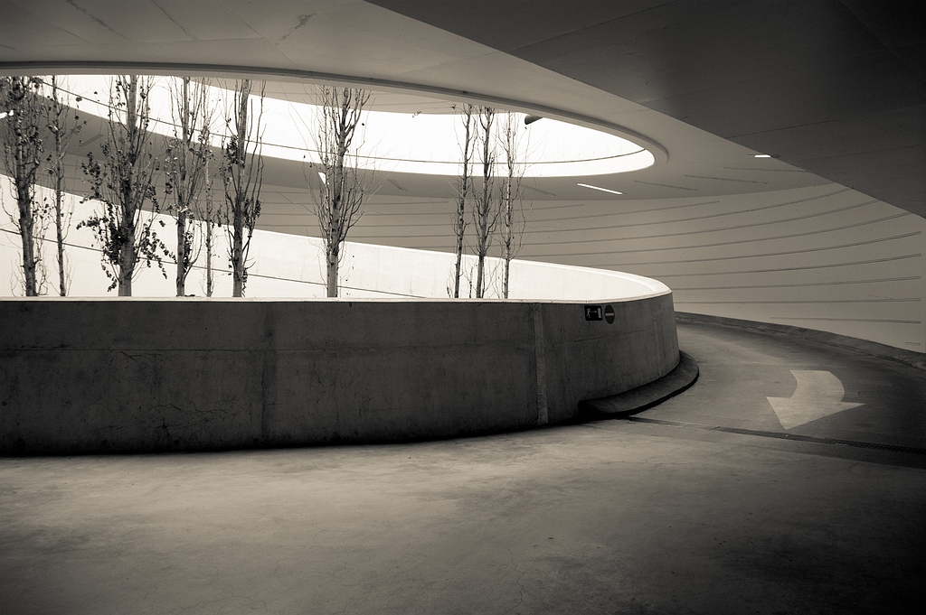 Een inrit van een parkeergarage levert een bijzonder lijnenspel op