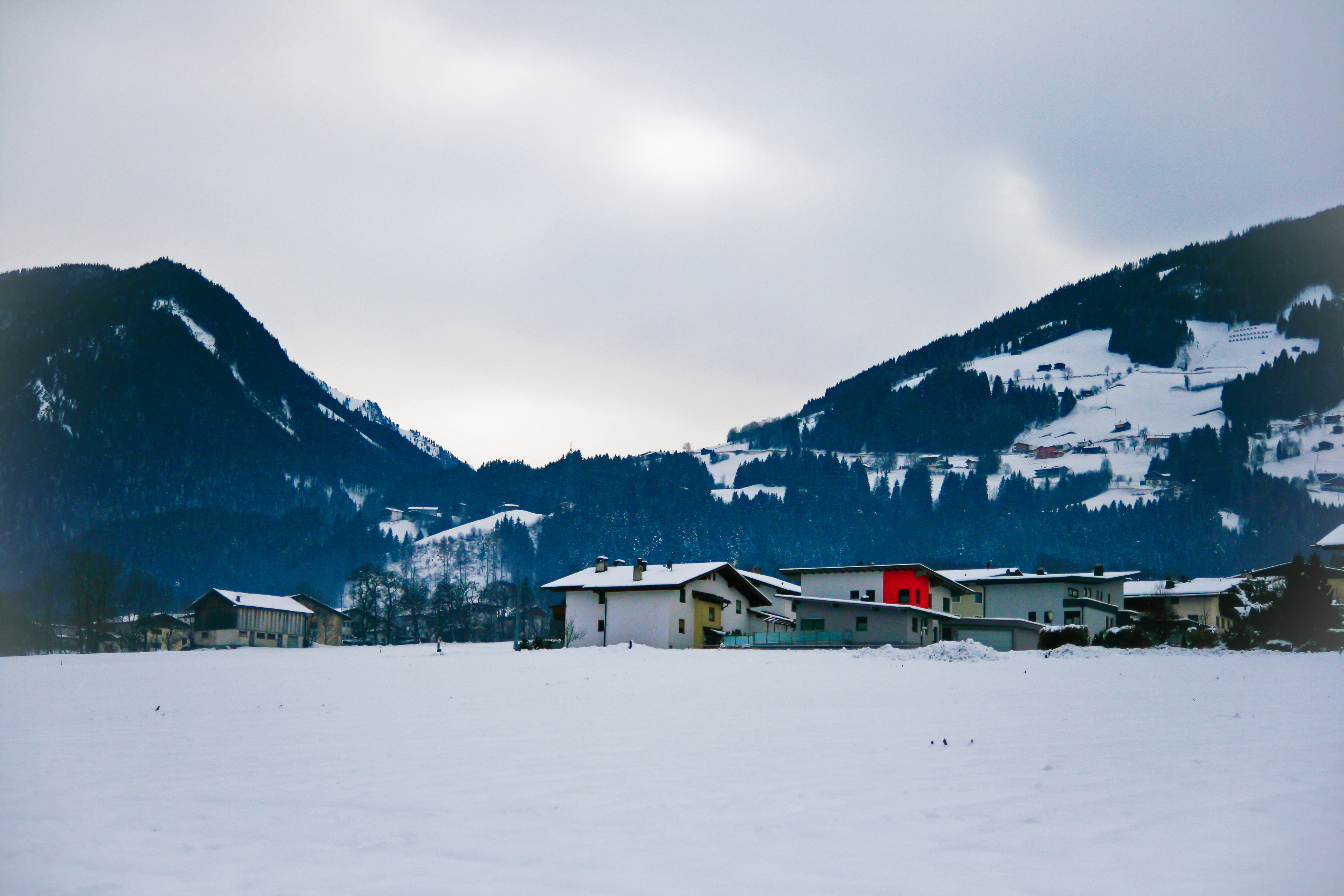 Rood element in een sneeuwwit landschap