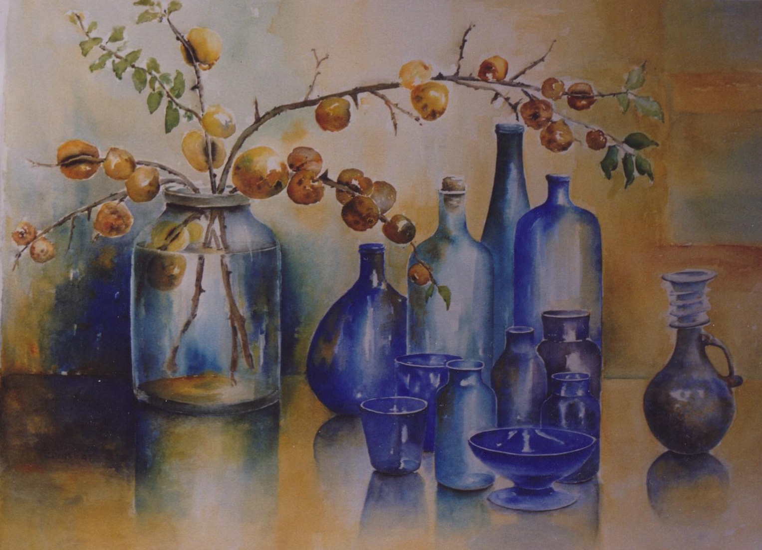 stilleven blauwe flessen