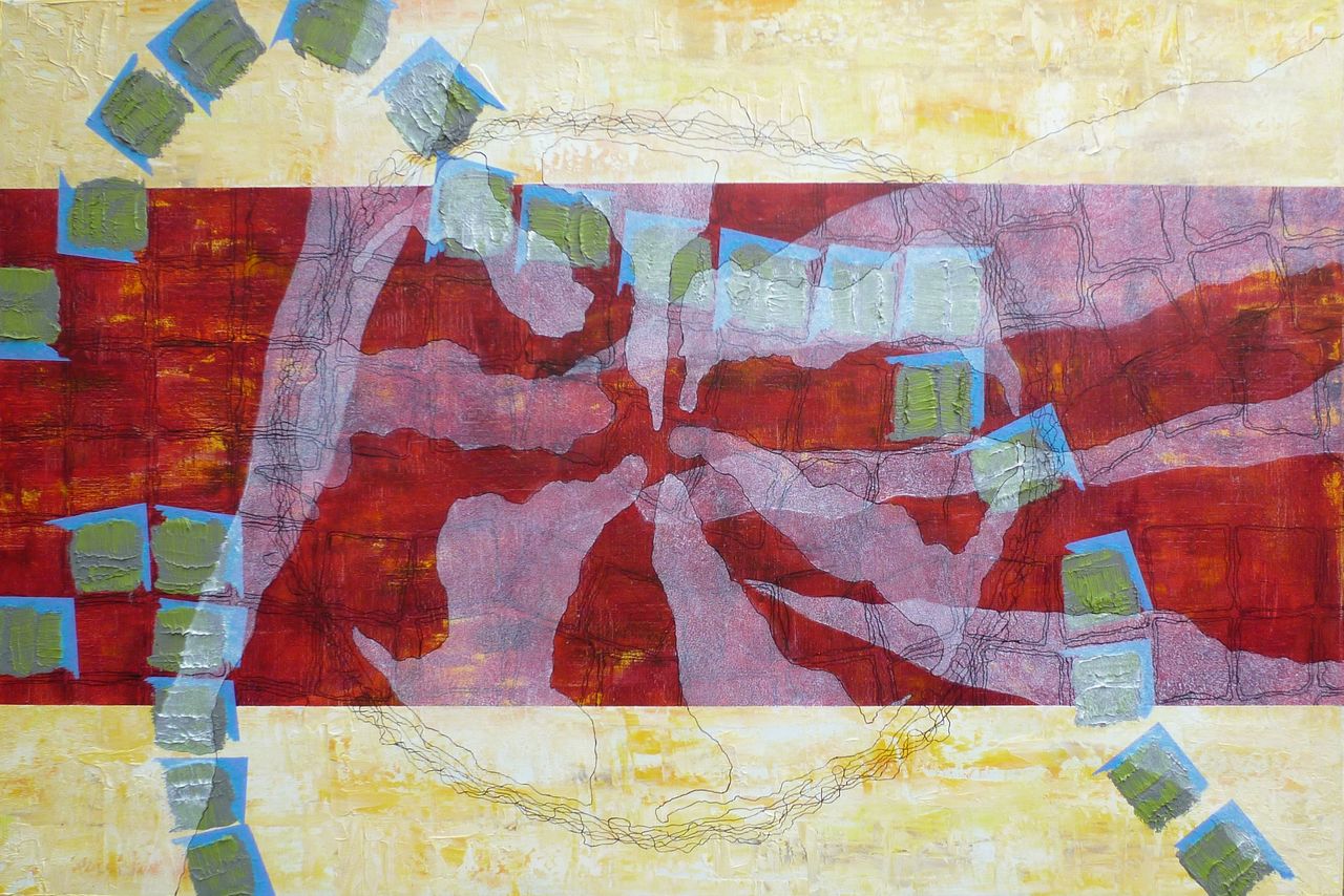 Abstract schilderij uitgevoerd in olieverf en inkt op linnen
