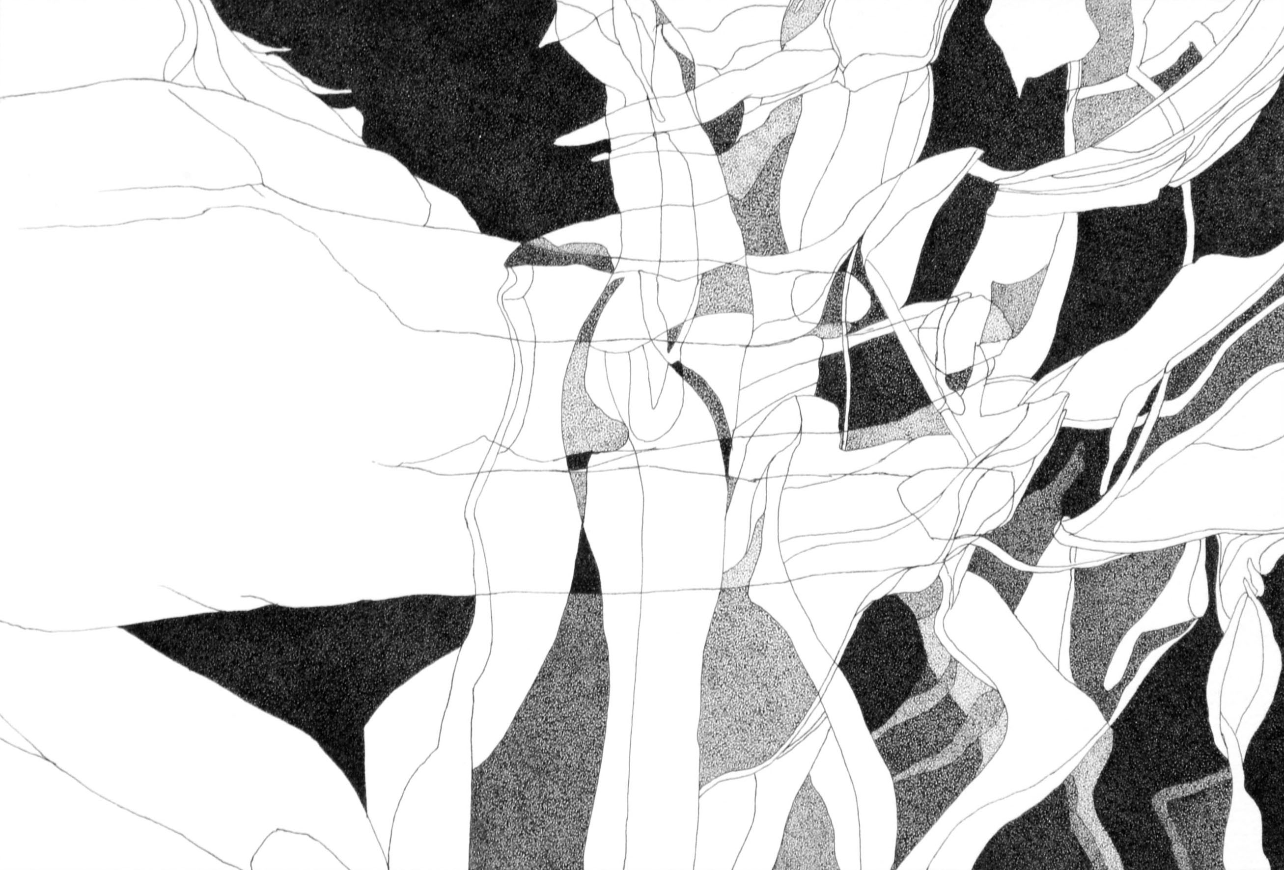 Spreekwoord 'Zijn vingers aan iets branden'. Oefening in versmelting figuur - structuur. Spelen met vlakwisseling. Zit samen in een passepartout met lucht 1, water 1, aarde 1, afmeting is per tekening. Materiaal inkt
