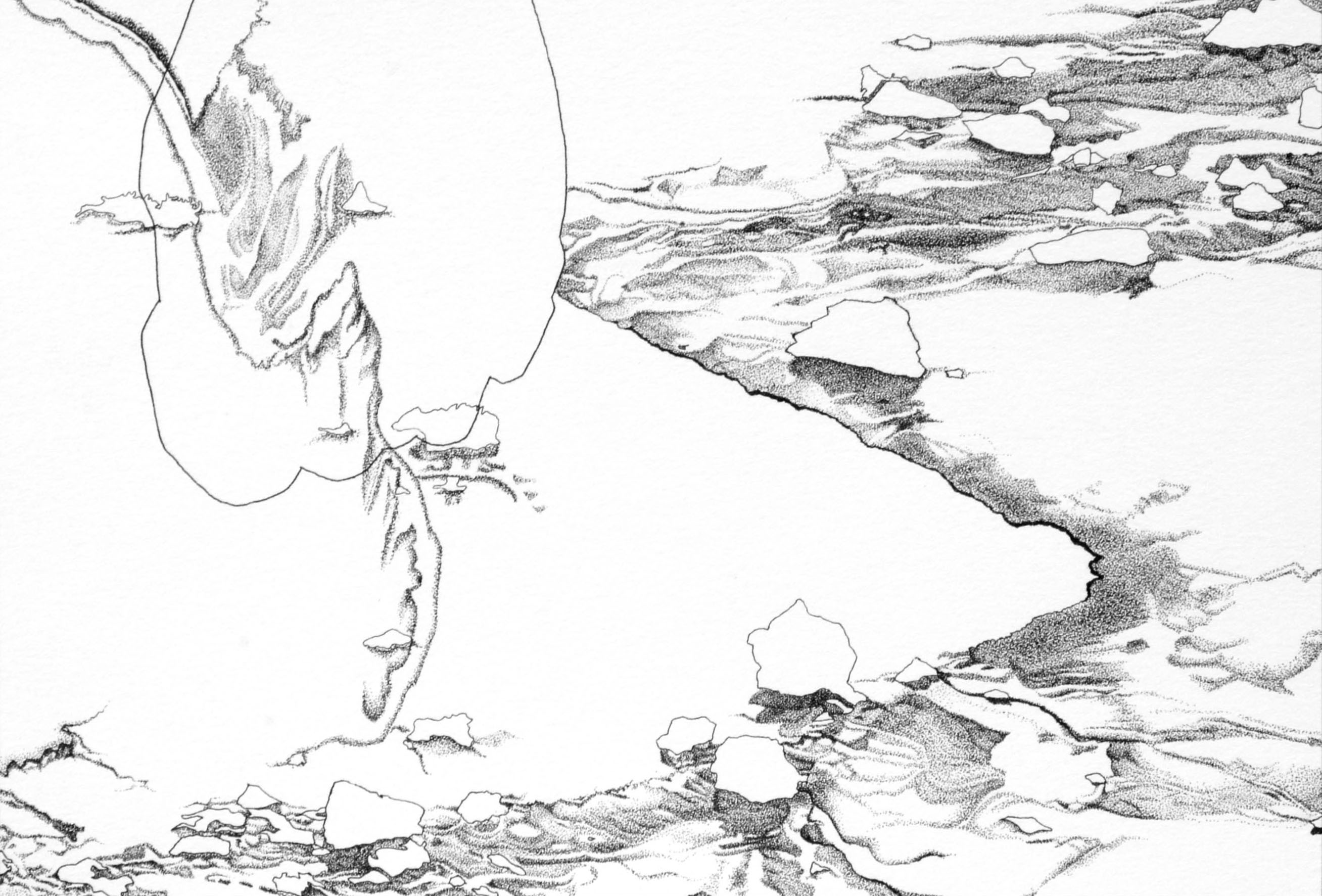 Spreekwoord 'Veel voeten in de aarde hebben'. Oefening in versmelting figuur - structuur. Wisselen van standpunt. Zit samen in een passepartout met lucht 2, water 2, vuur 2, afmeting is per tekening. Materiaal inkt