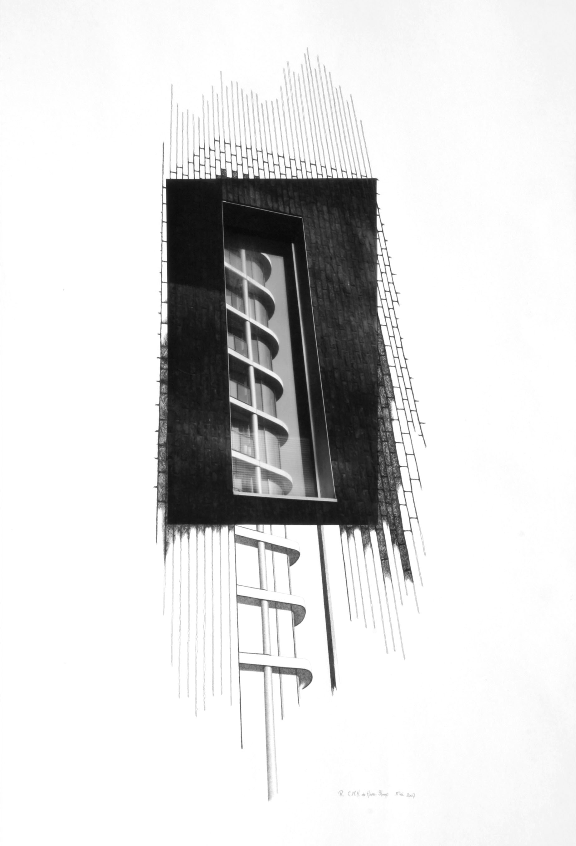 Tekenkunst maakt fotografiekunst af. Hierin lag voor mij de uitdaging. Dit werkstuk maakt deel uit van de serie 'Iconisch eerbetoon' in het kader van de monumentendagen in Eindhoven. De weerspiegeling van de Vestedatoren is een uit pixels opgebouwde foto. De suggestieve vervolmaking van het beeld is een uit stippels tekenkundige toevoeging.